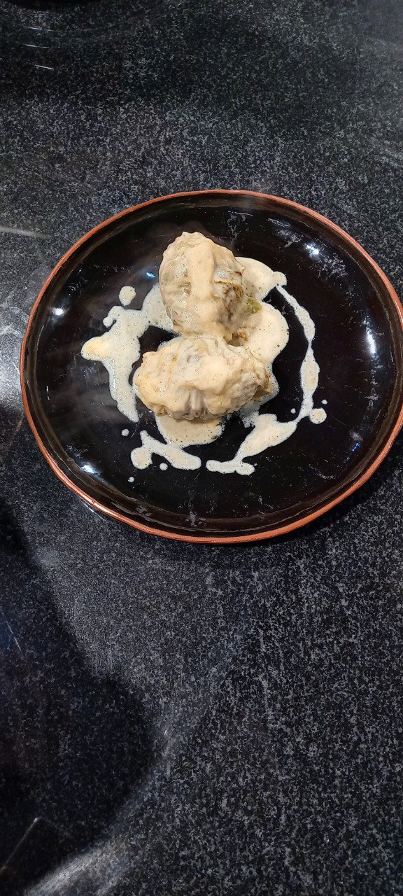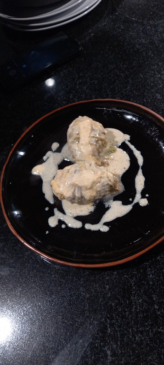 - Голубцы из косули с кус кусом в пекинской капусте соусом бешамель.