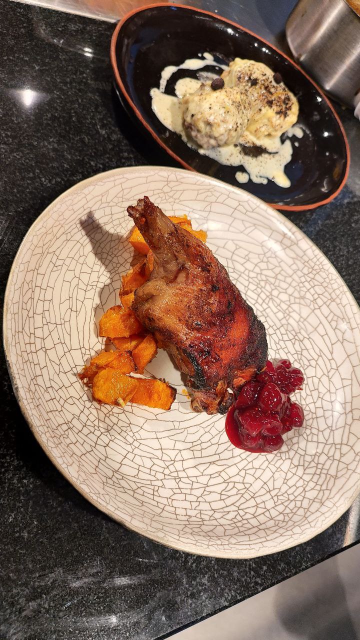 - Жаренное бедро нутрии с тыквой печеной и соусом из клюквы .