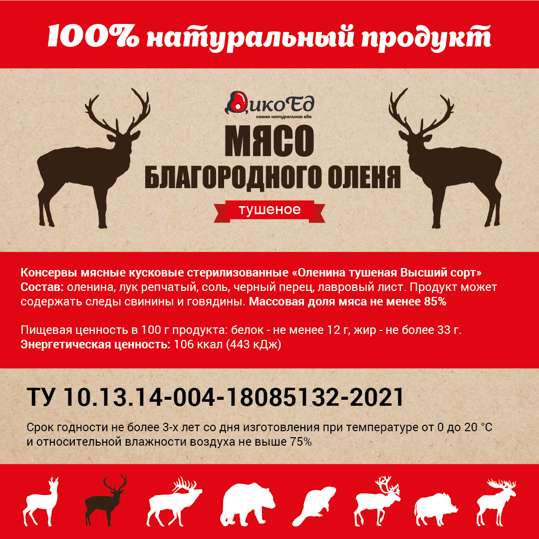 Приобрести тушеное мясо Европейского оленя предлагаем тем, кто собирается в дорогу, готовится к выезду на рыбалку или хочет иметь под рукой банку с вкусной едой, готовой к употреблению. В состав продукта входит оленина и натуральные приправы. Отсутствие острых и ярко выраженных специй позволяет насладиться естественным вкусом деликатеса. Тушеное мясо Европейского оленя можно употреблять с хлебом или гарнирами, а также использовать для приготовления жаркого, супов и других горячих блюд. Этот низкокалорийный продукт подходит для диетического питания. Несмотря на то, что оленина достаточно жесткая, после тушения она становится мягкой и нежной.