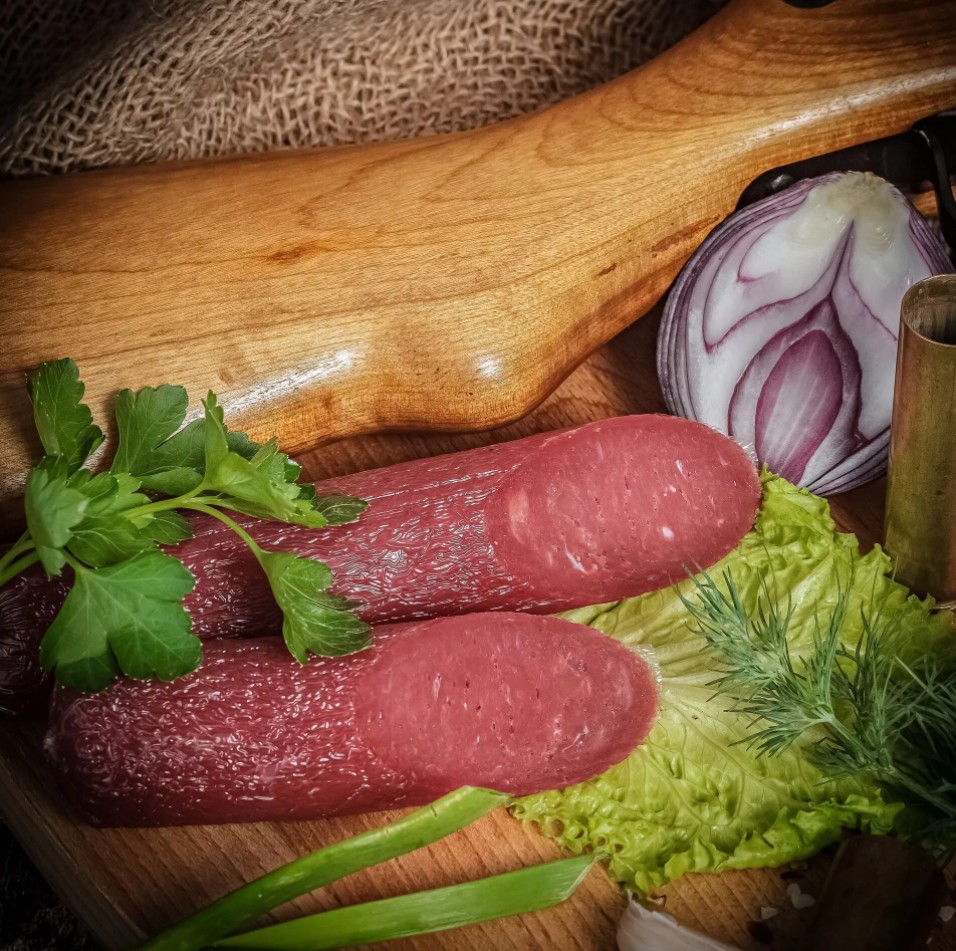 Колбаса приготовлена из мяса зайца, добытого в экологически чистом районе, и говядины. В качестве ингредиентов используют кориандр, смесь перцев, мускатный орех, тмин, посолочную смесь, натуральный краситель.